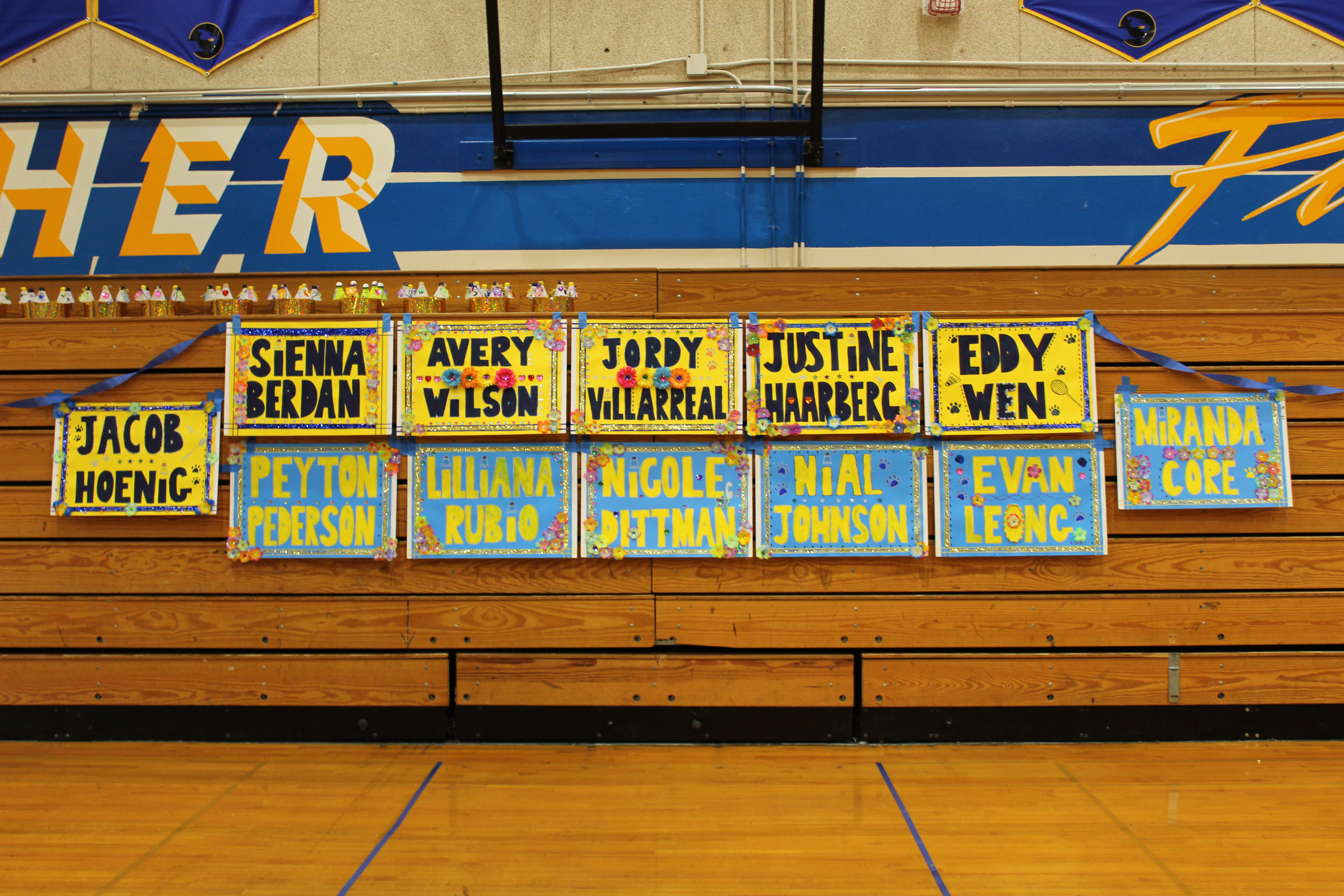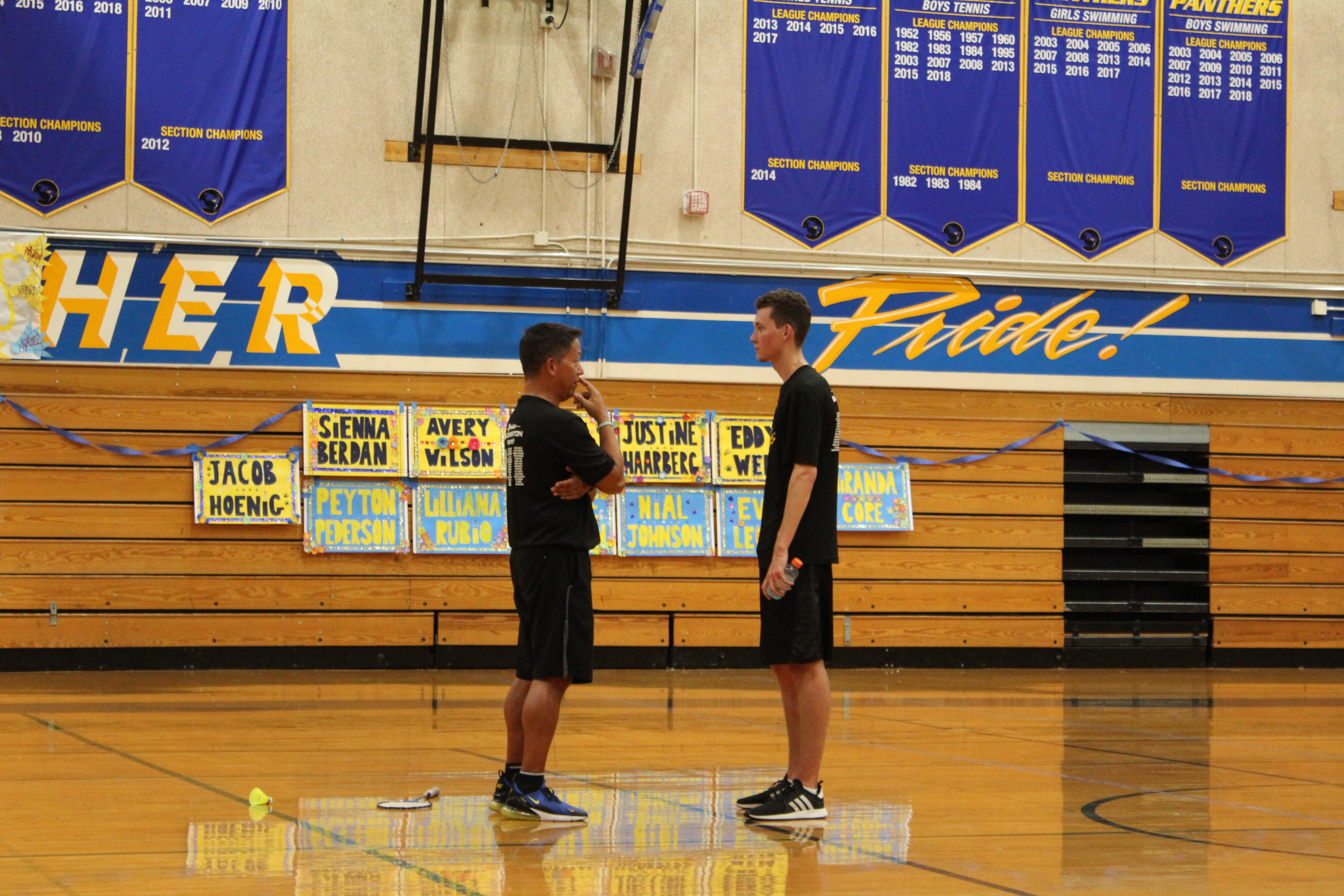 Names of the class of 2019 seniors Badminton juniors smile for the camera as they cheer on their teammates.Avery Wilson (12) and Miranda Core (12) reset after winning a point.Jacob Hoenig (12) smashes the birdie, scoring a point for his doubles team.Girls’ doubles #2 Miranda Core with her eye on the bird and partner Avery Wilson ready for the next shot.From left to right- Chaena Aquino, Alana Doi, and Angel Edpalina watching and supporting their teammates.Girls’ Singles #3 Viva Traver (11) drops the birdie to the opposite side of the court. Katie Han (11) smashes a deep clear. #2 co-ed doubles team Katie Han and Jacob Hoenig begin the point.Head Coach Stephens helps Aiden Sherry (11) strategize for his second game.Captain Nicole Dittman drops the bird back. Number one boys’ singles Tristan Kao (10) (left) preparing to return a serve and boys’ singles number two Aiden Sherry (11) returns a clear to his back hand.Senior Sienna Berdan on senior night.Number one boys’ singles Tristan Kao (10) drops the birdie back.From left to right- Sienna Berdan, Liliana Rubio, and Peyton Pederson on their senior night.From left to right- Avery Wilson, Jordy Villarreal, and Justine Haarberg on their senior night.The wonderful senior night set up.