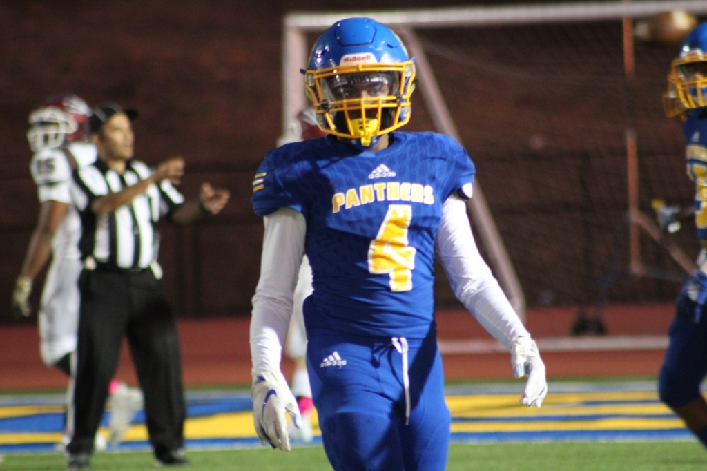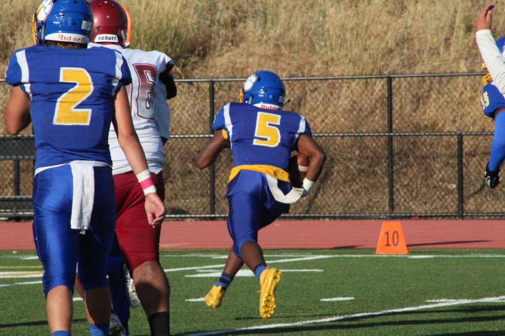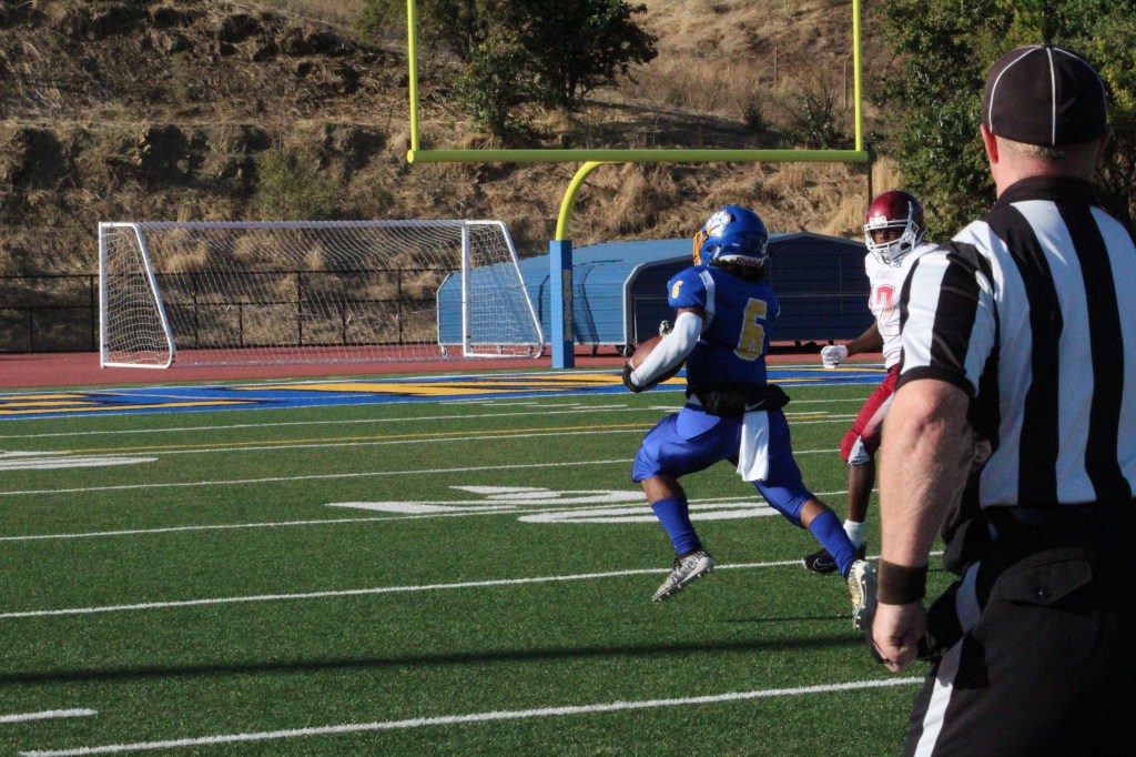 Julius Carroll (5) in control of the ball again runs unmatched towards the end zone.