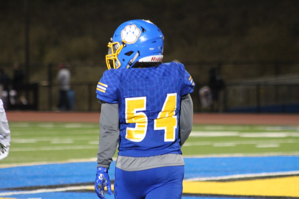 Kris Robinzine (54) walks onto the field as a starting defensive tackle.