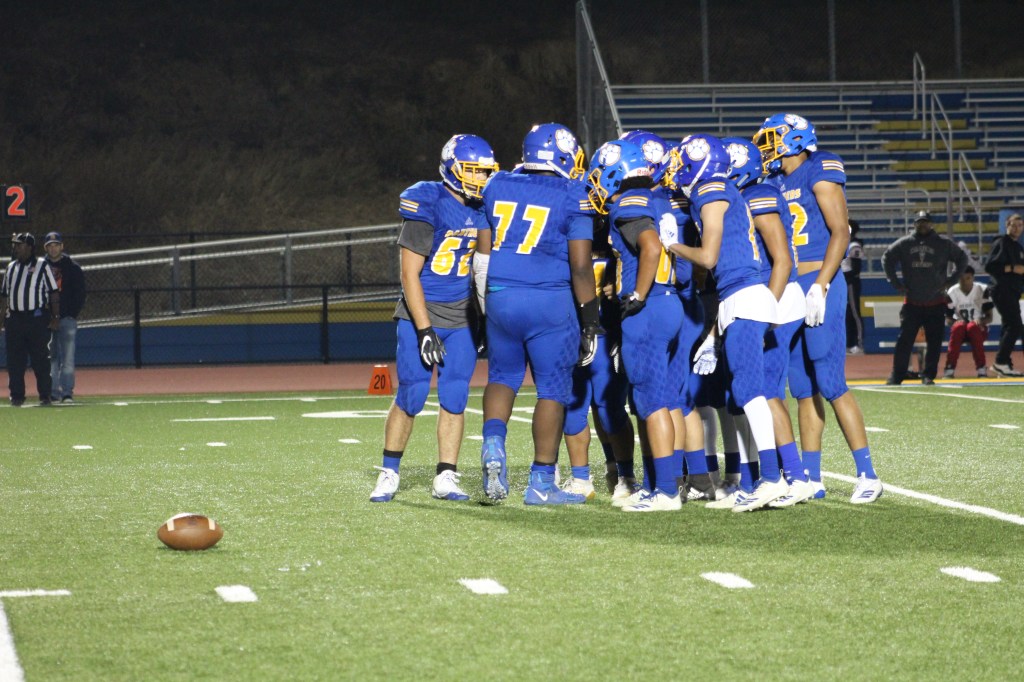 The Varsity team collects on the field in their 2nd time out of the night.