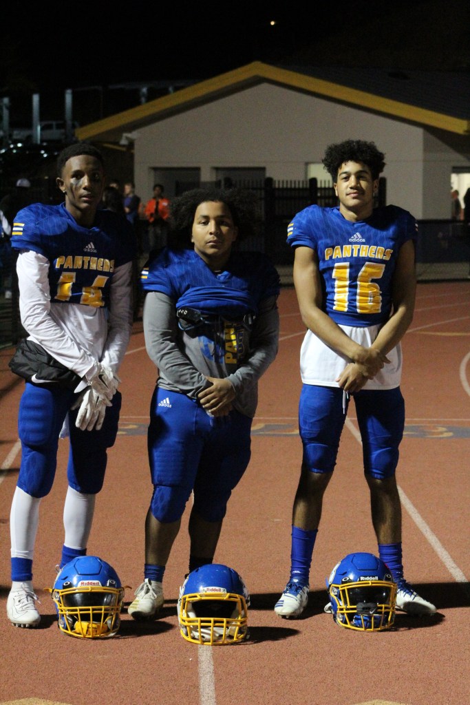Christopher Berhel (14), Kris Robinzine (54), Bilaal Jangikhan (16) all pose after the varsity game.